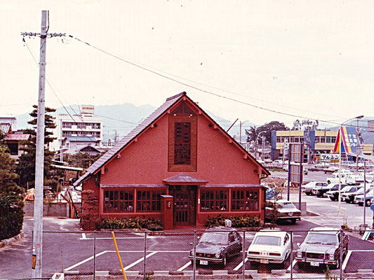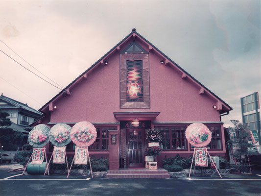 開店時の様子: 昭和53年(1978年)。正面にステンドグラスのあるモダンな建築です。